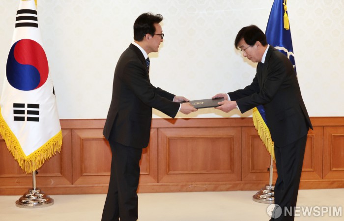 [서울=뉴스핌] 이길동 기자 = 김민석 국무총리가 11일 서울 종로구 정부서울청사에서 열린 의료혁신위원회 민간위원 위촉장 수여식에서 정기현 위원장에게 위촉장을 수여하고 있다. 2025.12.11 gdlee@newspim.com