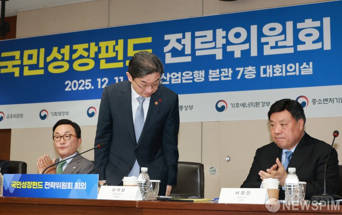 [서울=뉴스핌] 김학선 기자 = 이억원 금융위원장이 11일 서울 여의도 산업은행 본점에서 열린 국민성장펀드 전략위원회 회의에서 인사하고 있다. 2025.12.11 yooksa@newspim.com
