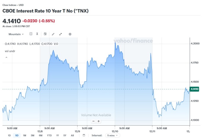 | 미 국채 10년물 차트, 자료=야후 파이낸스, 2025.12.12 koinwon@newspim.com |