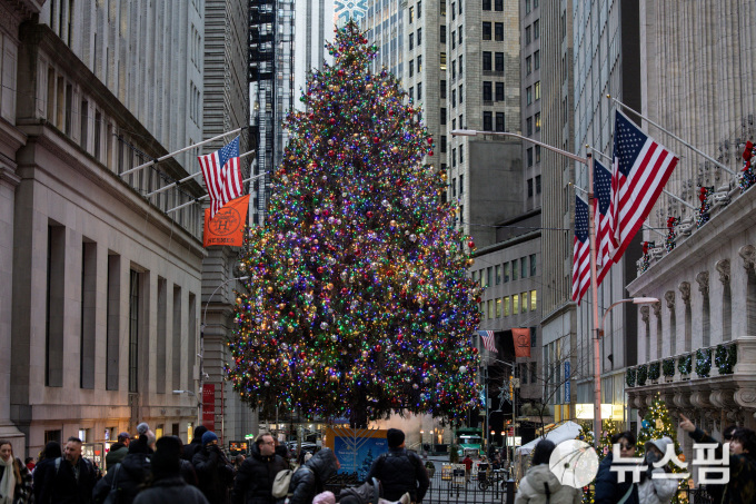 [뉴욕 로이터=뉴스핌] 최원진 기자= 11일(현지시간) 미국 뉴욕증권거래소(NYSE) 앞에 세워진 크리스마스 트리. 2025.12.12 wonjc6@newspim.com