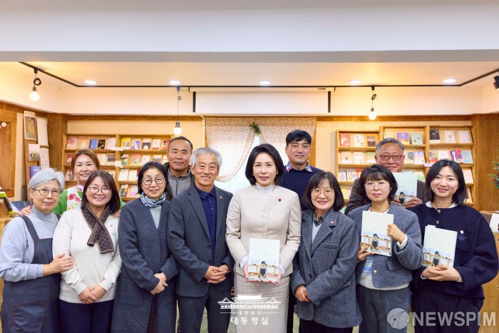 [서울=뉴스핌] 김혜경 여사가 지난 11일 충북 청주 쌍샘자연교회를 방문해 주민들과 기념촬영을 하고 있다. [사진=대통령실] 2025.12.12 photo@newspim.com