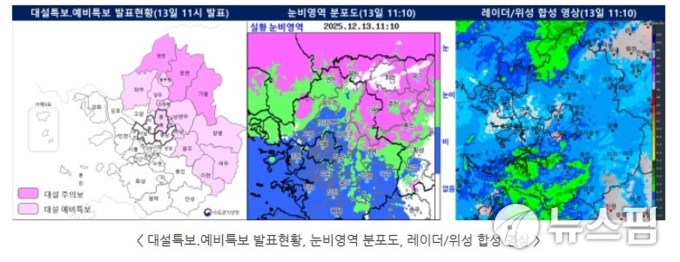 기상청은 수도권의 경우 오후부터 기온이 떨어지면서 늦은 오후부터 비가 눈으로 바뀌는 곳이 많겠고, 늦은 밤(21~24시)까지 눈이 이어질 것으로 내다봤다. 시간당 1~3cm의 무거운 눈이 내릴 가능성이 있어 대설특보 지역이 확대될 가능성도 있다.