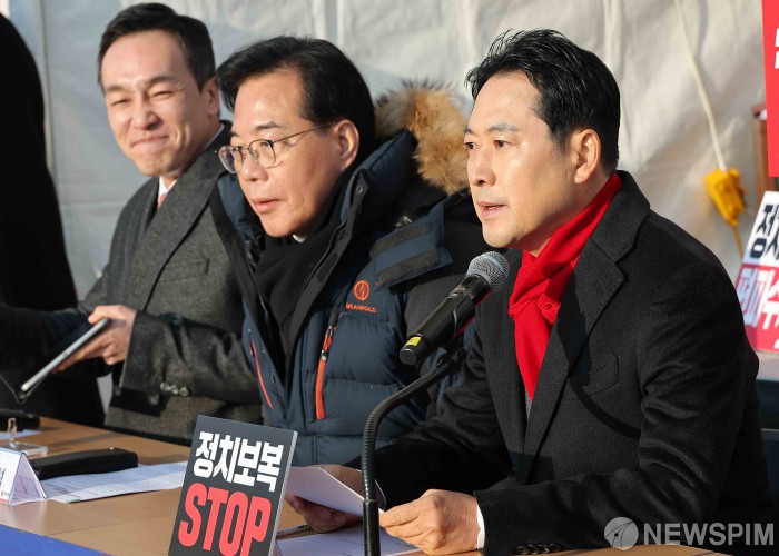 [서울=뉴스핌] 윤창빈 기자 = 송언석 국민의힘 원내대표가 15일 서울 여의도 국회 본관 앞 천막에서 열린 최고위원회의에서 모두발언을 하고 있다. 2025.12.15 pangbin@newspim.com