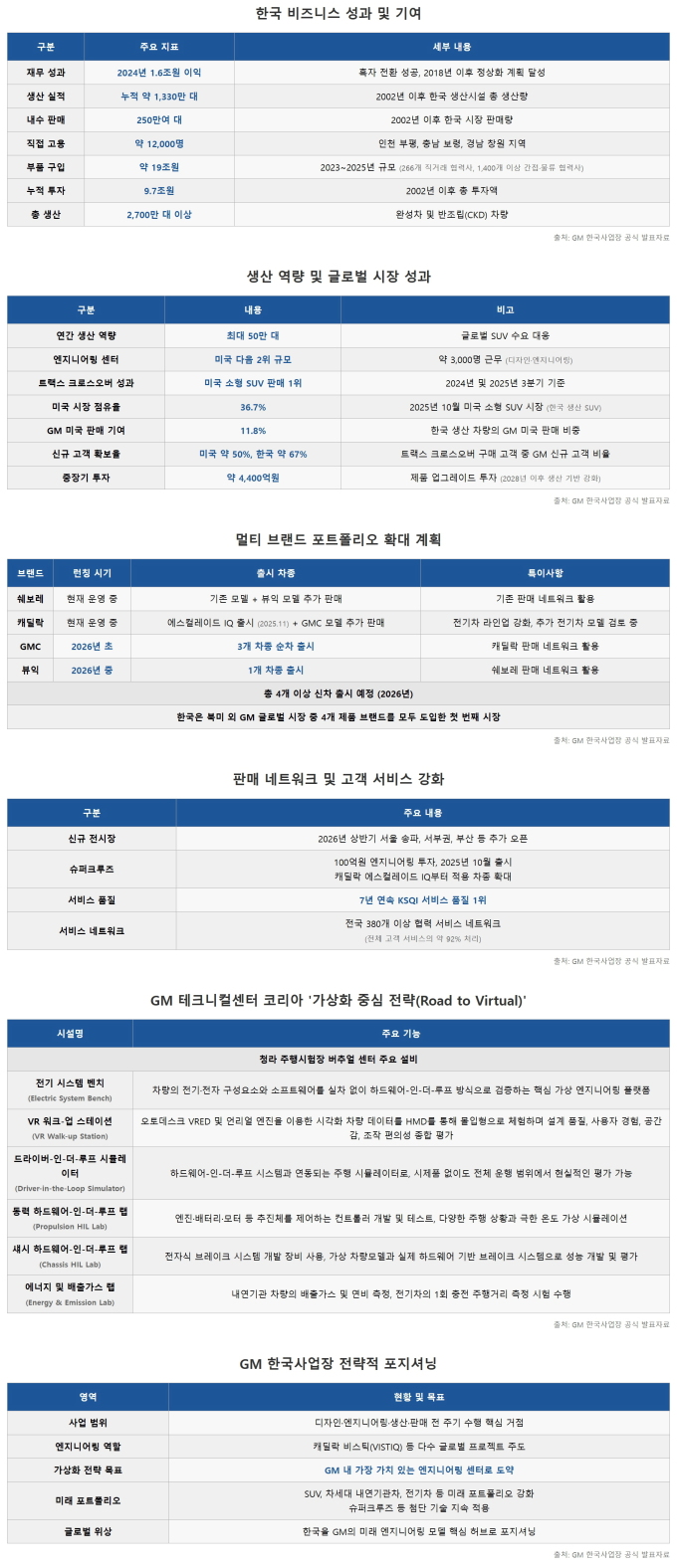 주요 내용으로는 ▲청라 주행시험장 내 신규 버추얼 센터 오픈을 통한 가상-실물 통합 개발 모델 전환과 한국의 글로벌 엔지니어링 허브 역할 강화 ▲2024년 흑자 기록과 지속가능한 수익 구조 구축 ▲국내 생산시설에 대한 지속 투자와 한국 생산 차량에 대한 글로벌 시장의 견조한 수요 ▲GMC·뷰익(Buick) 런칭을 포함한 국내 멀티 브랜드·채널 전략 확대 및 판매·서비스 네트워크 강화 등이 포함됐다.