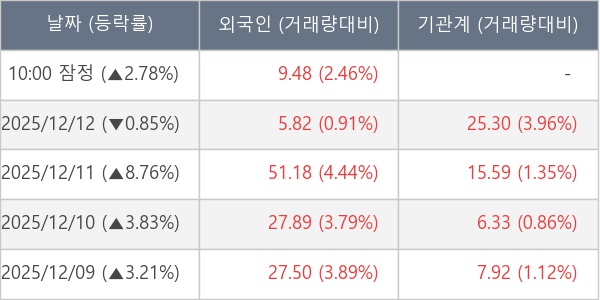 [서울=뉴스핌] 로보뉴스 = 15일 10시 15분 현재 대한광통신(010170)은 전일 대비 2.78% (현재가 2,405원) 상승했고, 외국인이 최근 6일 연속 순매수(누적 154.27만 주, 잠정) 행진을 하고 있다.