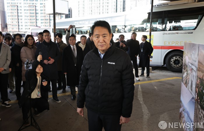 [서울=뉴스핌] 양윤모 기자 = 오세훈 서울시장이 15일 오전 광진구 구의동 동서울터미널을 방문 '동서울터미널 현대화사업' 개발대상지를 방문 신동우 신세계프라퍼티 본부장등이 참석한 가운데 관계자의 성명을 듣고 있다.동서울터미널 현대화사업은 동서울터미널 일대를 지하 7층∼지상 39층으로 2031년 완공을 목표로 민간사업자인 신세계프라퍼티가 주축인 신세계 동서울피에프브이(PFV)가 개발하는 사업이다. 2025.12.15 yym58@newspim.com