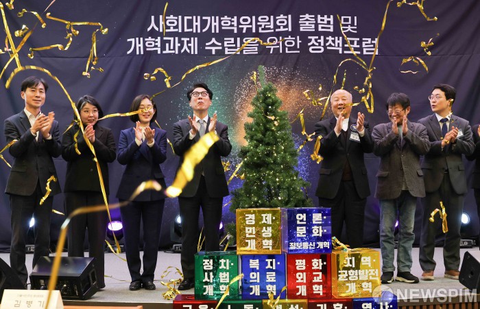 [서울=뉴스핌] 윤창빈 기자 = 김민석 국무총리를 비롯한 정당, 시민사회 단체 참석자들이 15일 서울 여의도 국회 박물관에서 열린 사회대개혁위원회 출범 및 개혁과제 수립을 위한 정책포럼에서 기념 퍼포먼스를 하고 있다. 2025.12.15 pangbin@newspim.com