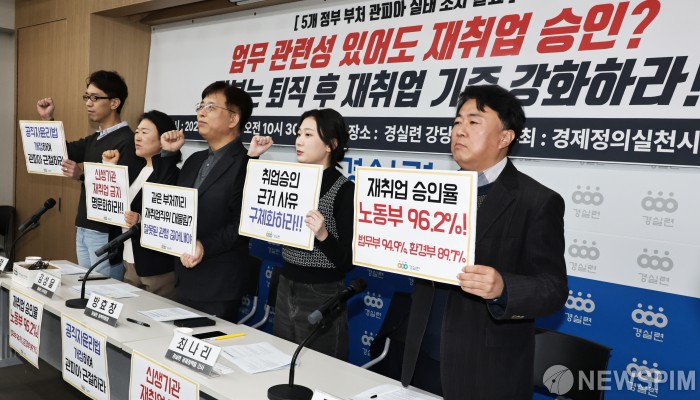 [서울=뉴스핌] 양윤모 기자 = 경실련이 16일 서울 종로구 경실련 강당에서 '관피아' 실태를 알리고 정부에 근절방안 마련을 촉구하는 5개 정부 부처(고용노동부·교육부·법무부·행정안전부·환경부)의 퇴직공직자들 재취업심사 현황을 발표하는 기자회견을 개최했다. 행사에는 정호철 경실련 경제정책팀 부장, 김성달 경실련 사무총장, 방효창 경실련 정책위원장, 최나리 경실련 경제정책팀 간사, 권오인 경실련 경제정책팀 국장이 참석했다. 2025.12.16 yym58@newspim.com