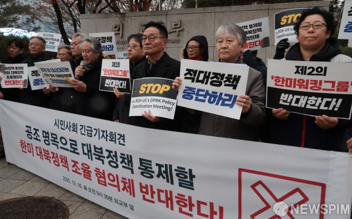 [서울=뉴스핌] 이길동 기자=자주통일평화연대 등 시민사회단체 관계자들이 16일 서울 종로구 외교부 앞에서 '한미 대북정책 조율 협의체' 반대 긴급 기자회견을 하고 있다. 2025.12.16 gdlee@newspim.com