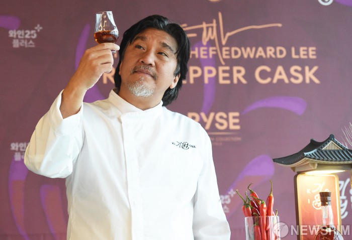 [서울=뉴스핌] 흑백요리사 에드워드 리 셰프가 16일 오전 서울 마포구 홍대 라이즈 호텔에서 기원(Ki One) 위스키와 협업으로 출시한 리미티드 에디션 ‘레드 페퍼 캐스크 (RED PEPPER CASK)' 출시 행사에서 제품의 색을 감상하고 있다. 기원 위스키는 오래 시간에 걸쳐 이중 숙성하는 방식으로 홍고추의 맛과 향, 바닐라·과실 향이 함께 구현되도록 설계했으며, ‘레드 페퍼 캐스크’는 GS리테일의 주류 스마트 오더 플랫폼 ‘와인25플러스(Wine25+)’를 통해 독점 판매된다. [사진=기원 위스키 ] 2025.12.16 photo@newspim.com