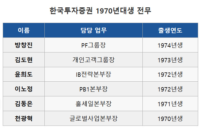 재선임된 방창진 전무(PF그룹장, 1974년생), 천광혁 전무(글로벌사업본부장, 1970년생), 윤희도 전무(IB전략본부장, 1972년생)는 모두 1970년대생이다.