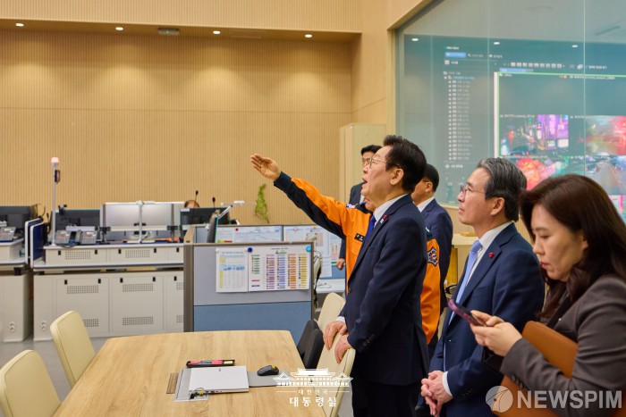 [서울=뉴스핌] 이재명 대통령이 16일 세종 나성동 소방청 119 종합상황실을 방문하고 있다. [사진=대통령실] 2025.12.16 photo@newspim.com3