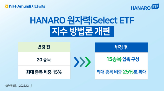 [서울=뉴스핌] 김가희 기자 = NH-Amundi자산운용은 17일 자사 'HANARO 원자력iSelect' 상장지수펀드(ETF)가 지수 방법론 개편에 따라 리밸런싱을 진행한다고 밝혔다.