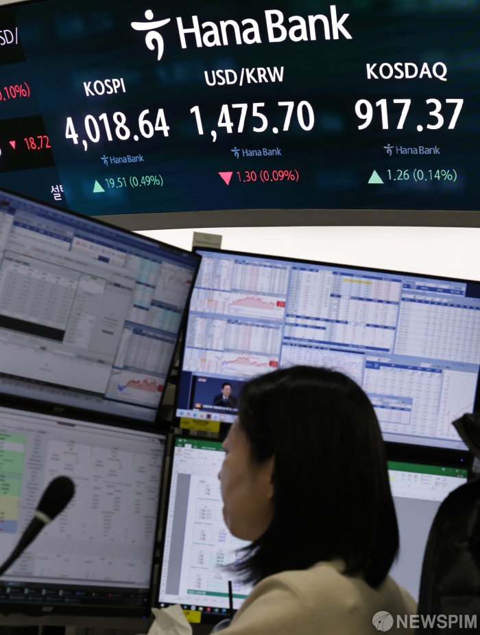 [서울=뉴스핌] 양윤모 기자 = 뉴욕 증시 3대 지수가 혼조세로 마감한 가운데, 17일 오전 코스피가 전장 종가보다 19.51 포인트(0.49%) 상승하며 4018.64로, 코스닥은 1.26 포인트(0.14%) 상승한 917.37로 장을 시작한 가운데, 서울 중구 하나은행 딜링룸에서 직원들이 업무를 보고 있다. 서울외환시장에서 달러/원 환율은 전장 대비 1.30원 하락한 1475.70원에 주간거래를 시작했다. 2025.12.17 yym58@newspim.com