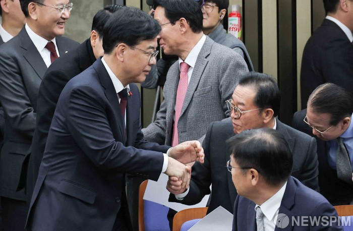 [서울=뉴스핌] 윤창빈 기자 = 송언석 국민의힘 원내대표가 17일 서울 여의도 국회에서 열린 정책의원총회에 참석하고 있다. 2025.12.17 pangbin@newspim.com