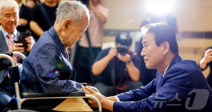 국가보훈부가 국가유공자 의료·복지 지원 체계를 대폭 강화한다. 권오을 국가보훈부 장관이 지난 9월 전북 전주보훈요양원에서 올해 100세 생일을 맞은 이석규 애국지사 '상수연'에 참석해 손을 맞잡고 있다. [사진=국가보훈부 제공] 2025.12.18 gomsi@newspim.com