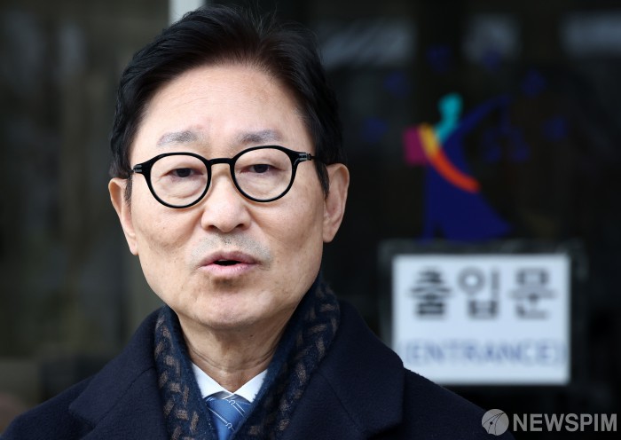 [서울=뉴스핌] 최지환 기자 = 박범계 더불어민주당 의원이 19일 오후 서울 양천구 서울남부지방법원에서 열린 패스트트랙 충돌 사건 선고기일에서 벌금 300만원 선고유예를 받은 뒤 입장을 밝히고 있다. 2025.12.19 choipix16@newspim.com