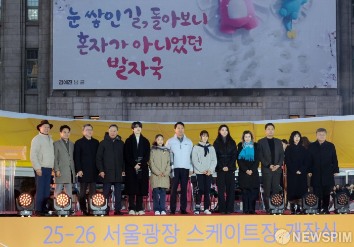[서울=뉴스핌] 이길동 기자 = 19일 오후 서울 중구 서울광장에서 열린 2025년-2026년 서울광장 스케이트장 개장식에서 차준환, 심석희 선수가 빙상 유망주에게 소장품 전달 후 오세훈 서울시장을 비롯한 참석 내빈들과 함께 기념촬영을 하고 있다.서울광장 스케이트장은 19일 개장해 내년 2월8일까지 52일 동안 운영된다. 올해로 19번째 겨울을 맞는 서울광장 스케이트장은 올해 '윈터 링(Winter Ring)'이라는 새로운 콘셉트로 시민과 관광객을 맞이한다. 입장료는 2004년 첫 개장부터 변함없는 1000원이다.운영시간은 일요일부터 금요일의 경우 오전 10시부터 오후 9시30분까지, 토요일과 공휴일의 경우 오전 10시부터 오후 11시까지다. 2025.12.19 gdlee@newspim.com