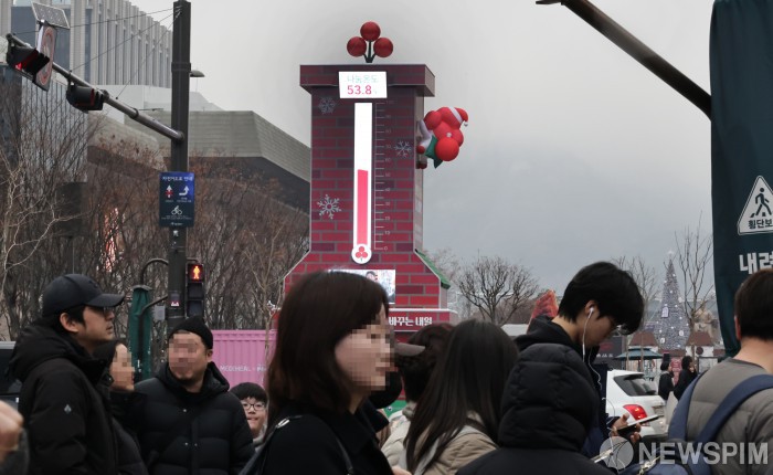 [서울=뉴스핌] 양윤모 기자 = 2025년도 저물어가는 20일 서울 종로구 광화문광장에 설치된 사랑의 온도탑 나눔 온도가 53.8도를 나타내고 있다. 2025.12.19 yym58@newspim.com