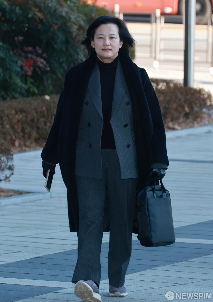 [서울=뉴스핌] 김학선 기자 = 최근 법무부 인사에서 고검 검사급 보직으로 사실상 강등된 정유미 검사장이 22일 오전 인사 효력을 멈춰달라며 낸 집행정지 신청 심문기일에 출석하기 위해 서울행정법원에 들어서고 있다. 2025.12.22 yooksa@newspim.com
