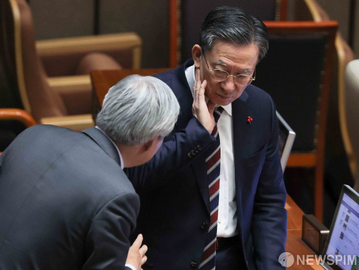[서울=뉴스핌] 윤창빈 기자 = 정성호 법무부 장관이 22일 서울 여의도 국회에서 열린 본회의에서 서왕진 조국혁신당 원내대표와 대화하고 있다. 2025.12.22 pangbin@newspim.com