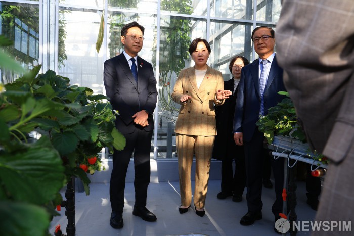 [서울=뉴스핌] 배경훈 부총리 겸 과학기술정보통신부 장관과 송미령 농림축산식품부 장관이 22일 오전 충청남도 천안시 연암대학교를 방문해 스마트팜 및 그린테크이노베이션센터에서 모듈형 유리온실 시설, 수직농장, 로봇 AI 접목 자동화 연구실, 인공광 기반 재배연구실 등을 둘러보고 있다. [사진=과학기술정보통신부] 2025.12.22 photo@newspim.com