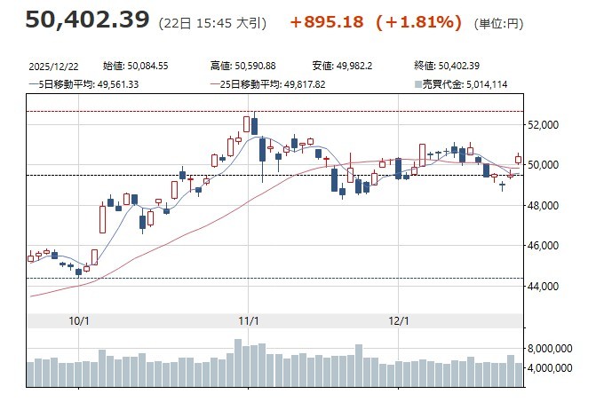 이날 닛케이225평균주가지수는 전일 종가보다 1.81%(895.18엔) 상승한 5만402.39엔에 거래를 마쳤다. 도쿄증권거래소주가지수(TOPIX, 토픽스)도 0.64%(21.51포인트) 오른 3405.17포인트로 마감했다.