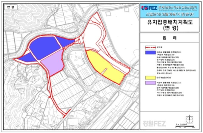 23일 강원경자청에 따르면 옥계 첨단소재융합 산업지구에 전국 경제자유구역 최초로 '업종 특례지구' 제도를 도입·확정하고, 유치 업종 확대를 통해 급변하는 산업 생태계에 대응할 수 있는 기반을 마련했다고 밝혔다. 이번 내용은 강원특별자치도 고시 제20205-538호로 개발 및 실시계획 변경이 고시됐다.