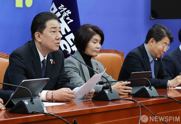[서울=뉴스핌] 윤창빈 기자 = 김병기 더불어민주당 원내대표가 23일 서울 여의도 국회에서 열린 원내대책회의에서 모두발언을 하고 있다. 2025.12.23 pangbin@newspim.com