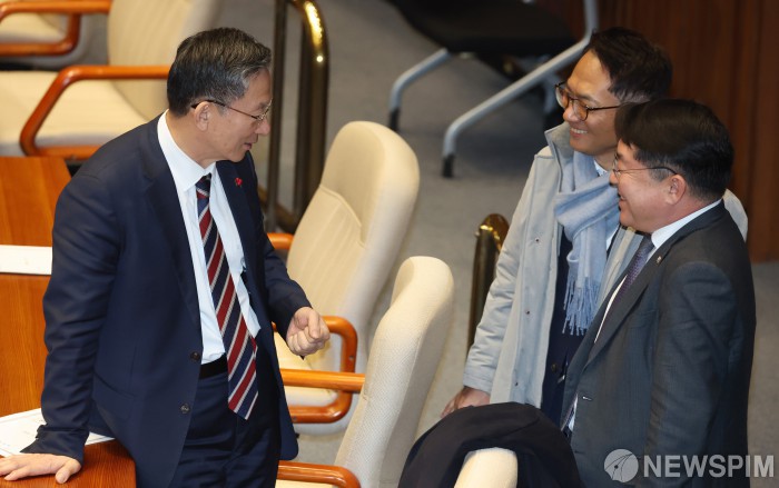 [서울=뉴스핌] 정일구 기자 = 정성호 법무부 장관이 23일 서울 여의도 국회에서 열린 본회의에서 의원들과 대화를 나누고 있다. 2025.12.23 mironj19@newspim.com