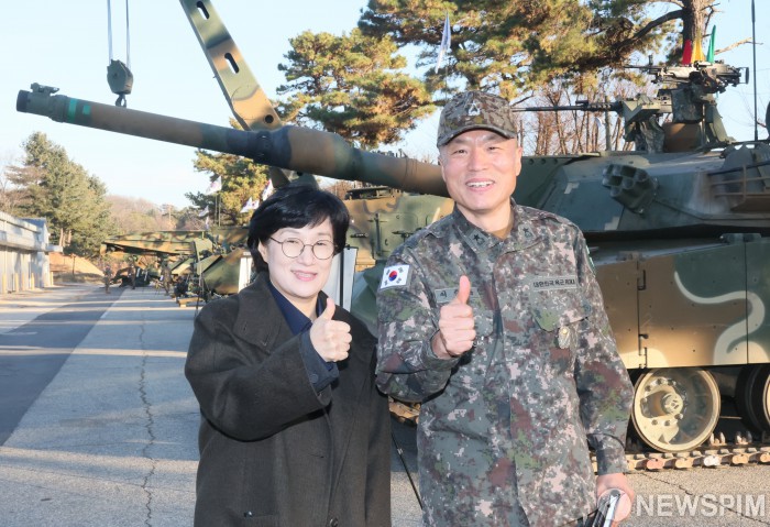 [서울=뉴스핌] 원민경 성평등가족부 장관이 22일 오후 경기도 고양시 육군 제30기갑여단을 방문해 국군장병에 대한 감사한 마음을 담아 위문금을 전달하고 기념촬영을 하고 있다. [사진=한국은행] 2025.12.23 photo@newspim.com