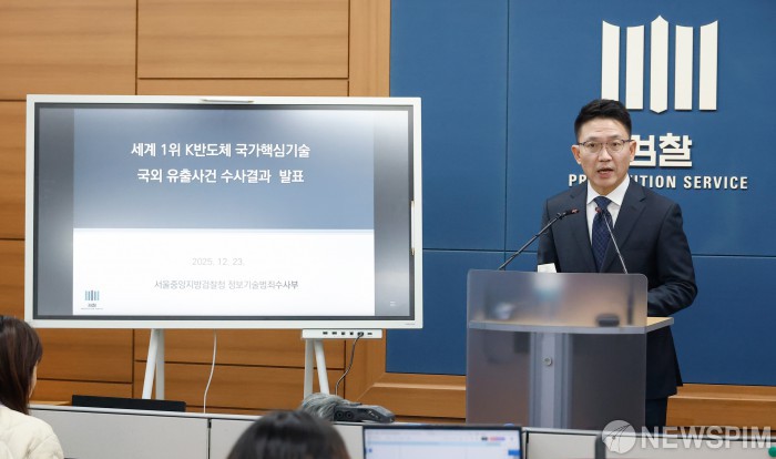 [서울=뉴스핌] 류기찬 기자 = 김윤용 서울중앙지방검찰청 정보기술범죄수사부 부장검사가 23일 오후 서울 서초구 서울고등검찰청 브리핑룸에서 '세계 1위 K반도체 국가핵심기술 국외 유출사건 수사결과'를 발표하고 있다. 2025.12.23 ryuchan0925@newspim.com