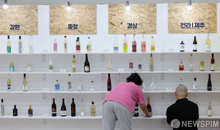 [서울=뉴스핌] 김학선 기자 = 25일 서울 양재동 aT센터에서 열린 2025 대한민국 농업박람회에서 각 지역별 전통주가 전시되어 있다. 농업박람회는 2019년 처음 개최돼 올해로 7회를 맞는 국내 대표 농업·농촌 종합박람회다. 2025.09.25 yooksa@newspim.com