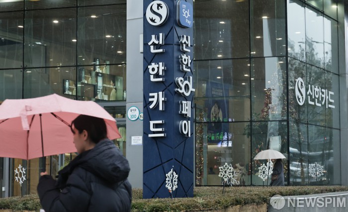 [서울=뉴스핌] 양윤모 기자 = 국내 최대 신용카드사인 신한카드에서 약 19만명의 개인정보가 유출된 것으로 23일 확인됐다. 서울시 중구에 있는 신한카드 본사앞을 시민들이 이동하고 있다. 2025.12.23 yym58@newspim.com