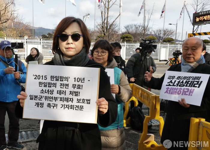 [서울=뉴스핌] 양윤모 기자 = 2015년 한일 일본군 '위안부' 합의가 체결된 지 10년을 앞둔 24일 오전 정의기억연대와 한일역사정의평화행동 등 시민단체 회원들이 서울 종로구 외교부 앞에서 한일합의 전면 무효·소녀상 테러 처벌·일본군 위안부 피해자 보호법 개정 촉구 기자회견를 개최후 문서를 전달하기 위해 외교부로 이동하고 있다. 2025.12.24 yym58@newspim.com