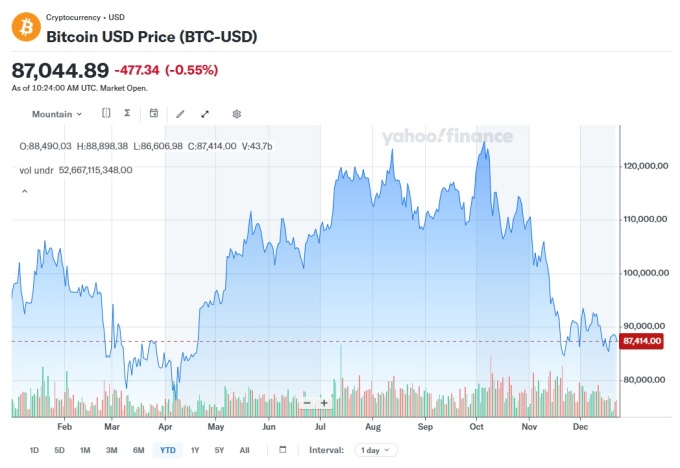 비트코인 가격 차트, 자료=야후 파이낸스, 2025.12.24 koinwon@newspim.com