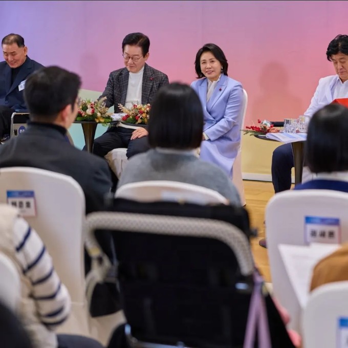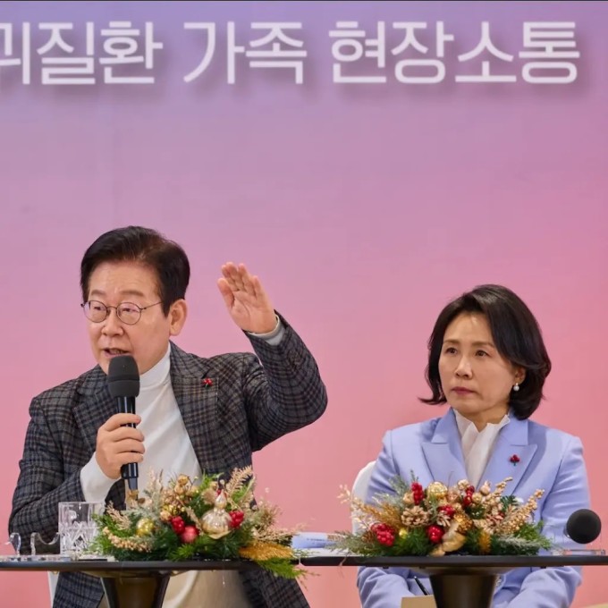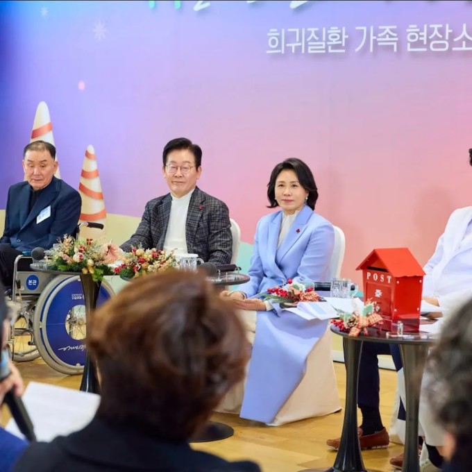 이재명 대통령과 김혜경 여사가 성탄절을 하루 앞둔 24일 오후 서울 신촌세브란스 연세암병원 중입자치료센터에서 희귀질환 환우·가족들과 현장 소통 간담회를 하고 있다. [사진=KTV]