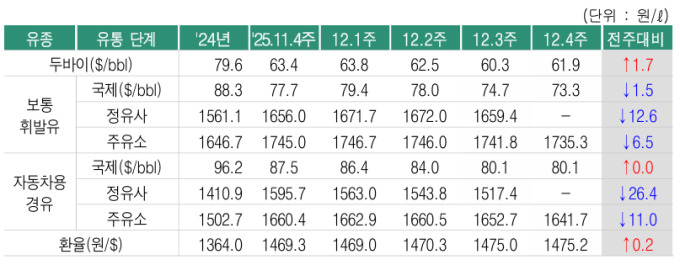 이번주 국제유가는 우크라이나의 러시아 석유시설 공격과 미국의 베네수엘라 유조선 나포 본격화 등으로 공급 차질 우려가 부각되면서 상승했다.