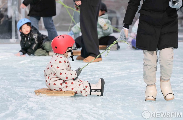 [서울=뉴스핌] 윤창빈 기자 = 27일 서울 송파구 가든파이브 중앙광장에 마련된 2025 하하호호 눈썰매장에서 아이들이 얼음 썰매를 즐기고 있다. 2025.12.27 pangbin@newspim.com
