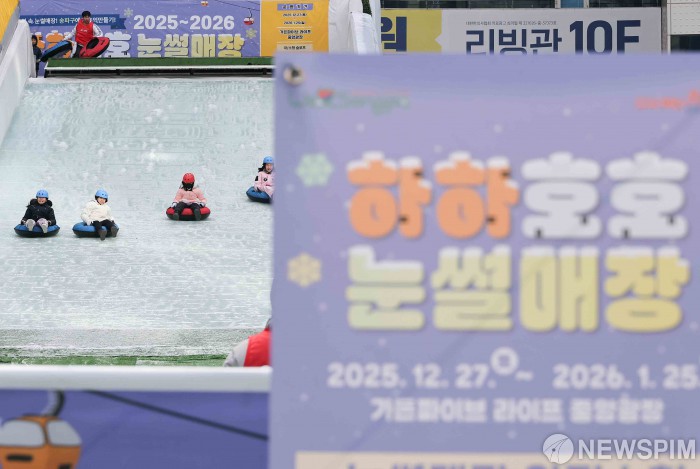 [서울=뉴스핌] 윤창빈 기자 = 27일 서울 송파구 가든파이브 중앙광장에 마련된 2025 하하호호 눈썰매장에서 아이들이 얼음 썰매를 즐기고 있다. 2025.12.27 pangbin@newspim.com