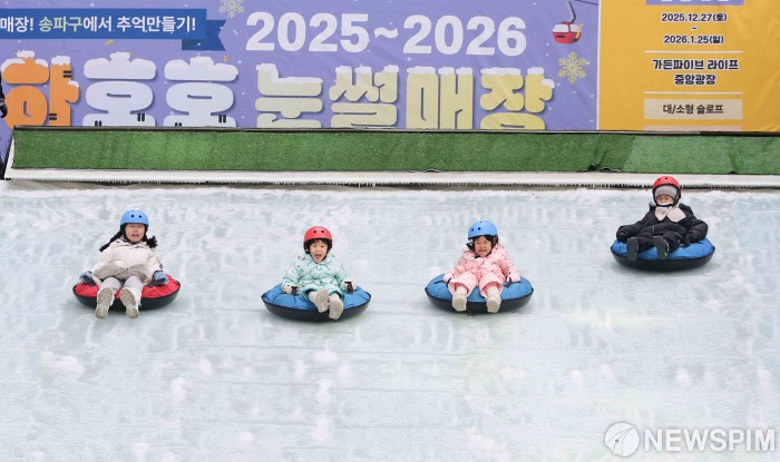 [서울=뉴스핌] 윤창빈 기자 = 27일 서울 송파구 가든파이브 중앙광장에 마련된 2025 하하호호 눈썰매장에서 아이들이 얼음 썰매를 즐기고 있다. 2025.12.27 pangbin@newspim.com
