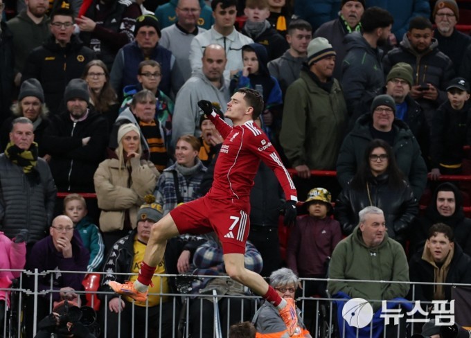 [리버풀 로이터=뉴스핌] 박상욱 기자=비르츠가 28일(한국시간) EPL 18라운드 울버햄프턴과 홈 경기에 데뷔골을 넣고 골 셀레브레이션을 하고 있다. 2025.12.28 psoq1337@newspim.com