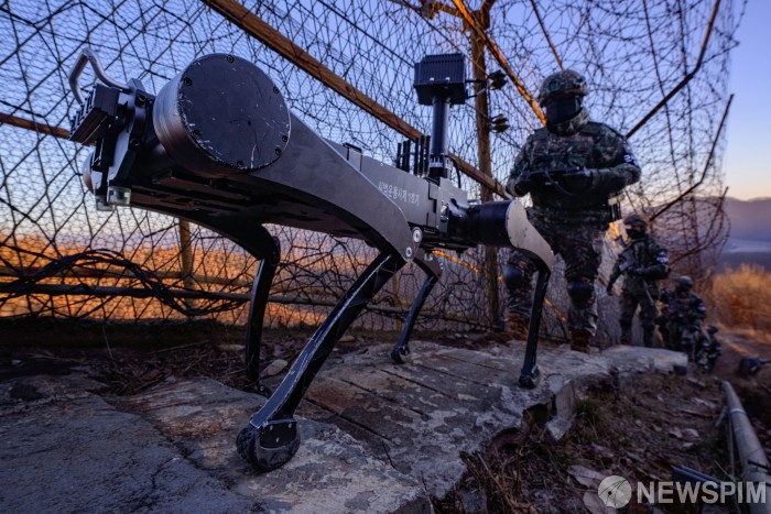 [연천=뉴스핌] 류기찬 기자 = 철책선 넘어 밝아오는 태양 아래, 군은 새로운 전투 시대를 맞이하고 있다. 지난 22일 오전 경기 연천군 5사단 열쇠부대 군 장병들이 지난해부터 대테러작전·수색·정찰 등 다양한 군사 임무에서 시범운용중인 다족 보행 로봇과 함께 철책 경계 근무에 나섰다. 다족 보행 로봇은 육군이 추진 중인 차세대 전투체계 '아미 타이거' 전투실험의 하나로 또 다른 전투원 역할을 수행하기 위해 투입됐다. 2025.12.29 ryuchan0925@newspim.com
