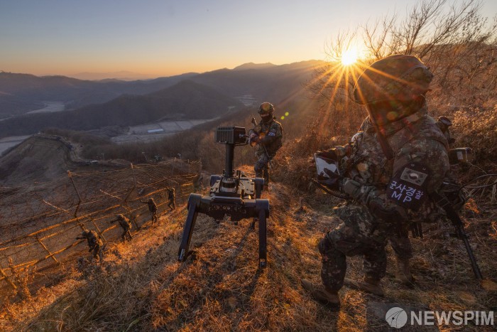 [연천=뉴스핌] 류기찬 기자 = 철책선 넘어 밝아오는 태양 아래, 군은 새로운 전투 시대를 맞이하고 있다. 지난 22일 오전 경기 연천군 5사단 열쇠부대 군 장병들이 지난해부터 대테러작전·수색·정찰 등 다양한 군사 임무에서 시범운용중인 다족 보행 로봇과 함께 철책 경계 근무에 나섰다. 다족 보행 로봇은 육군이 추진 중인 차세대 전투체계 '아미 타이거' 전투실험의 하나로 또 다른 전투원 역할을 수행하기 위해 투입됐다. 2025.12.29 ryuchan0925@newspim.com