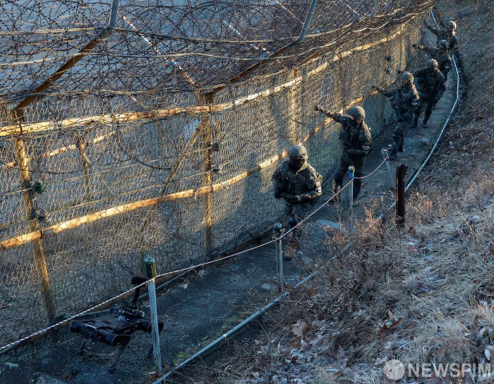 [연천=뉴스핌] 류기찬 기자 = 철책선 넘어 밝아오는 태양 아래, 군은 새로운 전투 시대를 맞이하고 있다. 지난 22일 오전 경기 연천군 5사단 열쇠부대 군 장병들이 지난해부터 대테러작전·수색·정찰 등 다양한 군사 임무에서 시범운용중인 다족 보행 로봇과 함께 철책 경계 근무에 나섰다. 다족 보행 로봇은 육군이 추진 중인 차세대 전투체계 '아미 타이거' 전투실험의 하나로 또 다른 전투원 역할을 수행하기 위해 투입됐다. 2025.12.29 ryuchan0925@newspim.com