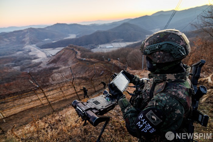 [연천=뉴스핌] 류기찬 기자 = 철책선 넘어 밝아오는 태양 아래, 군은 새로운 전투 시대를 맞이하고 있다. 지난 22일 오전 경기 연천군 5사단 열쇠부대 군 장병들이 지난해부터 대테러작전·수색·정찰 등 다양한 군사 임무에서 시범운용중인 다족 보행 로봇과 함께 철책 경계 근무에 나섰다. 다족 보행 로봇은 육군이 추진 중인 차세대 전투체계 '아미 타이거' 전투실험의 하나로 또 다른 전투원 역할을 수행하기 위해 투입됐다. 2025.12.29 ryuchan0925@newspim.com
