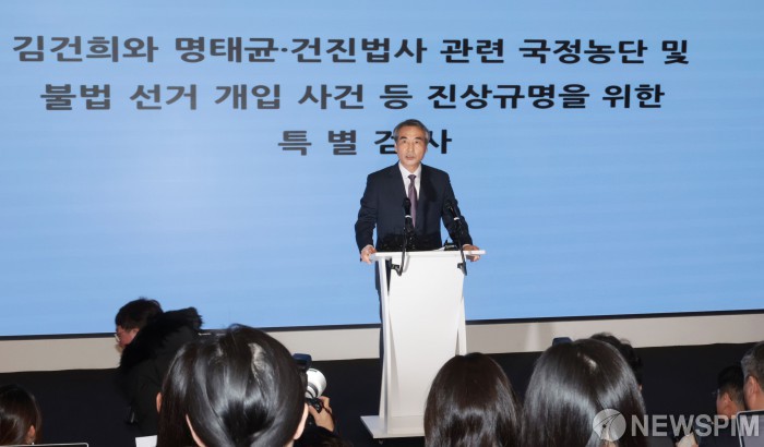 [서울=뉴스핌] 이길동 기자 = 김건희 씨 의혹을 수사한 민중기 특별검사가 29일 서울 종로구 KT광화문빌딩에 마련된 특검 사무실에서 최종 수사 결과를 발표하고 있다. 2025.12.29. gdlee@newspim.com