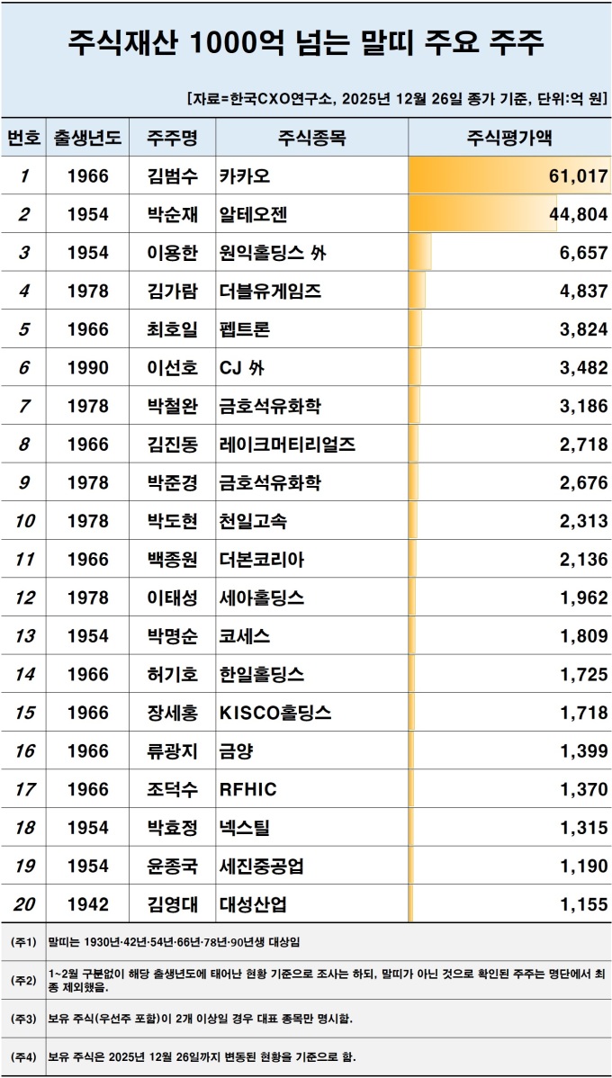 주식재산 1조 원을 넘긴 말띠 주주는 2명이다. 김범수 카카오 창업자와 박순재 알테오젠 회장이 이름을 올렸다. 대기업집단 총수 중에서는 이용한 원익그룹 회장이 말띠로 조사됐다.