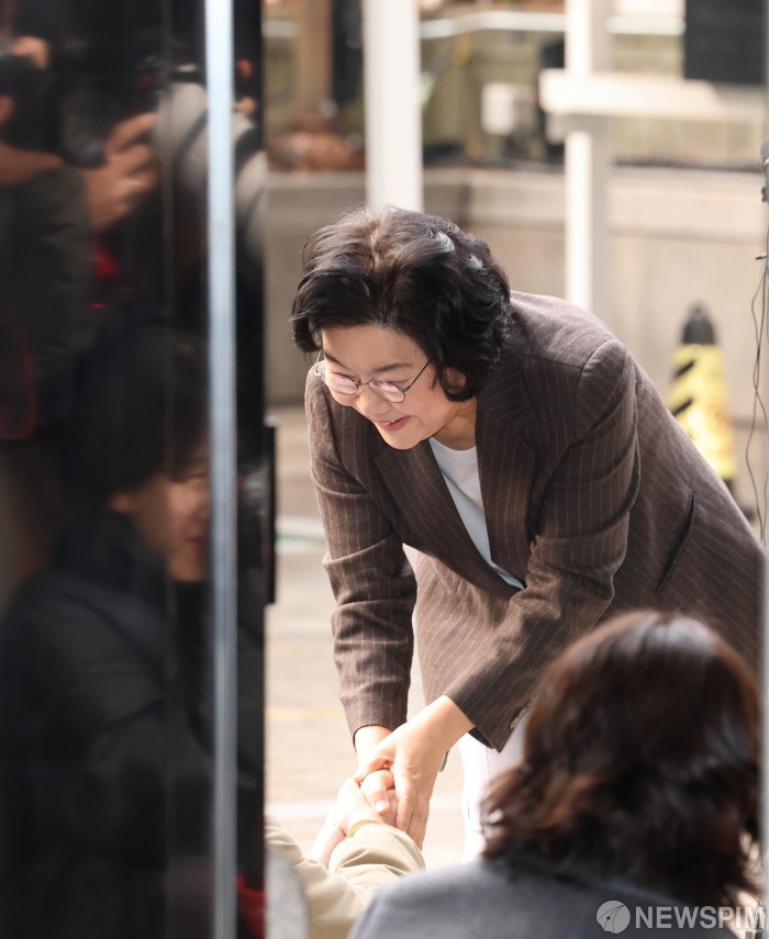 [서울=뉴스핌] 최지환 기자 = 이혜훈 초대 기획예산처 장관 후보자가 29일 오전 서울 중구 예금보험공사 본사에 마련된 인사청문회 준비 사무실로 출근하며 취재진과 인사하고 있다. 2025.12.29 choipix16@newspim.com