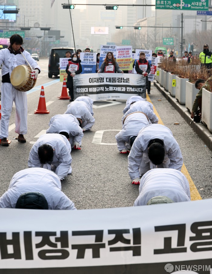 [서울=뉴스핌] 최지환 기자 = 청와대 비정규직 노동자들이 29일 서울 종로구 광화문광장에서 고용 보장을 촉구하며 청와대로 삼보일배하고 있다. 2025.12.29 choipix16@newspim.com